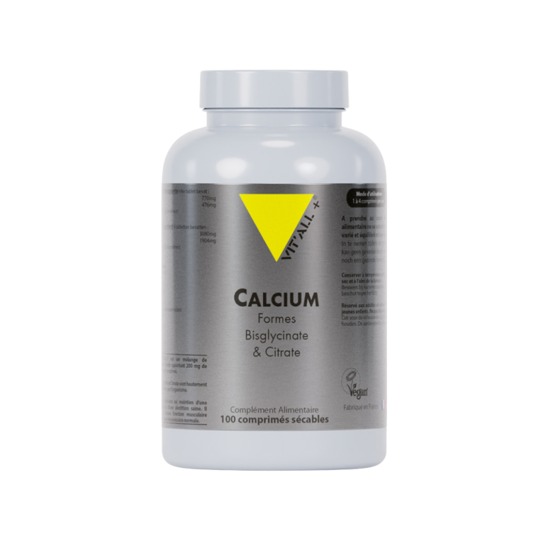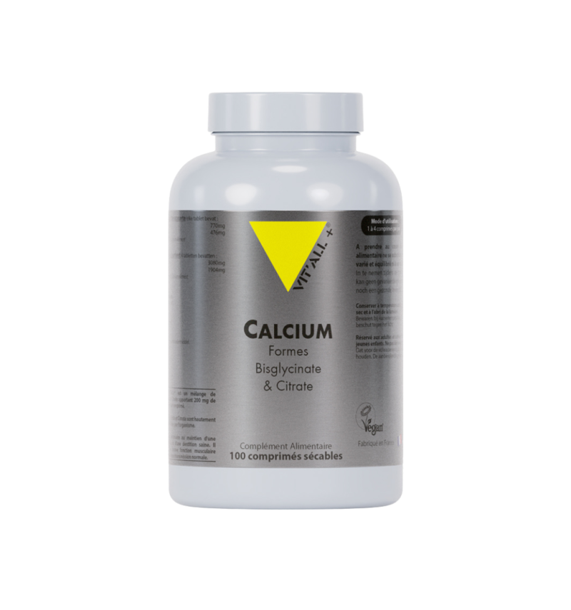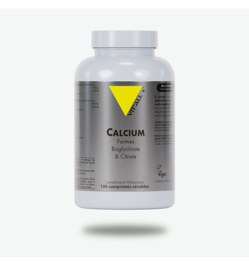 Calcium Bisglycinate & Citrate de Vit'all+ : Formule combinée avec deux sources biodisponibles de calcium très bien tolérées par l'organisme, offrant 200mg de calcium élément par comprimé.