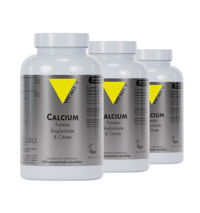 Calcium Bisglycinate & Citrate de Vit'all+ : Formule combinée avec deux sources biodisponibles de calcium très bien tolérées par l'organisme, offrant 200mg de calcium élément par comprimé.