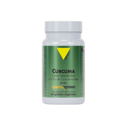 Le Curcuma Curcugreen® est un extrait hautement standardisé en curcuminoïdes (famille regroupant les différentes formes de curcumines : curcumine, demethoxycurcumine, bisdemethoxycurcumine et cyclocurcumine), associé à de l’Huile essentielle de Curcuma (contenant majoritairement de l’ar-turmerone), pour une biodisponibilité naturellement supérieure.