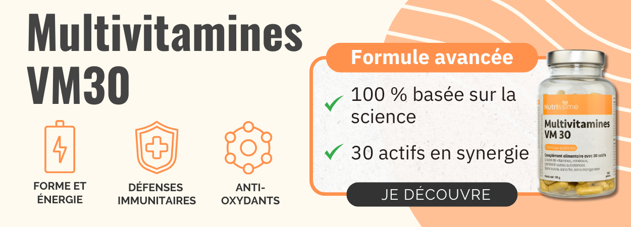 Un MVM bien formulé, à des doses physiologiques, sans fer, cuivre et manganèse, comme le multivitamines & multiminéraux VM30, ne présente pas de risque pour la santé. Les études disponibles montrent que l’utilisation à long terme de MVM à des doses ne dépassant pas les limites de sécurité est sûre pour la majorité des individus en bonne santé.