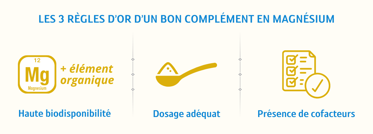 Mais tous les sels de magnésium ne se valent pas : certains ont une teneur en magnésium trop faible, tandis que d’autres ne sont pas assez biodisponibles ou pas accompagnés de cofacteurs qui aident à leur assimilation. En outre, des études ont montré qu’il est important de ne pas prendre trop de magnésium en une seule fois, au risque que l’organisme l’élimine sans en bénéficier (on recommande de répartir plusieurs prises de 50 à 100 mg de magnésium tout au long de la journée).