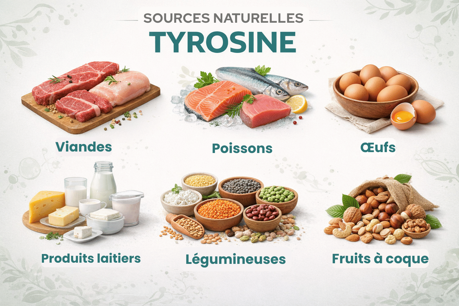 - 100 g de viande (~20 g protéines) → ~1 g de tyrosine