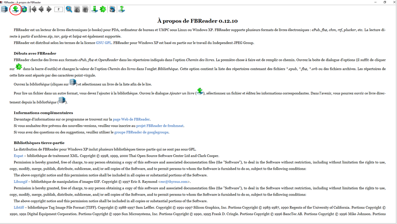 Tout d'abord, lancez le logiciel FBReader, vous tomberez sur la page "à propos". Sélectionnez ensuite le symbole entouré en rouge sur la photo ci-dessous.