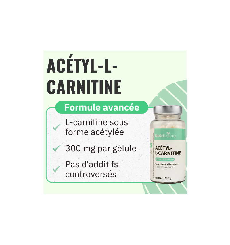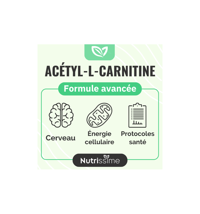 Complément alimentaire à base de L-carnitine sous forme acétylée (ALCAR), active et biodisponible. Cette forme est réputée pour passer la barrière hémato-encéphalique.