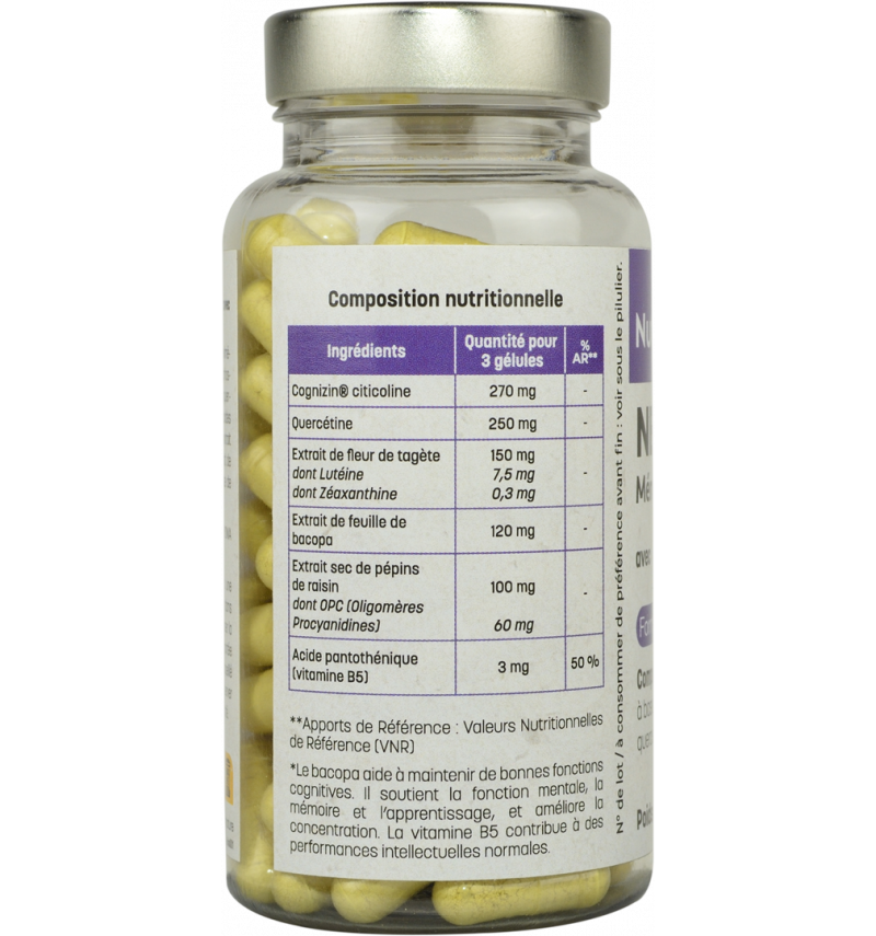 Enveloppe de la gélule : hydroxypropylméthylcellulose, Cognizin® Citicoline (cytidine 5’- diphosphocholine), agent de charge : gomme d’acacia, quercétine, antiagglomérant : sels de magnésium d’acides gras, extrait de fl eur de tagète (Tagetes erecta), extrait de feuille de bacopa (Bacopa monnieri L.), extrait de pépin de raisin (Vitis vinifera L.), D-pantothénate de calcium (acide pantothénique, vitamine B5).
