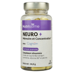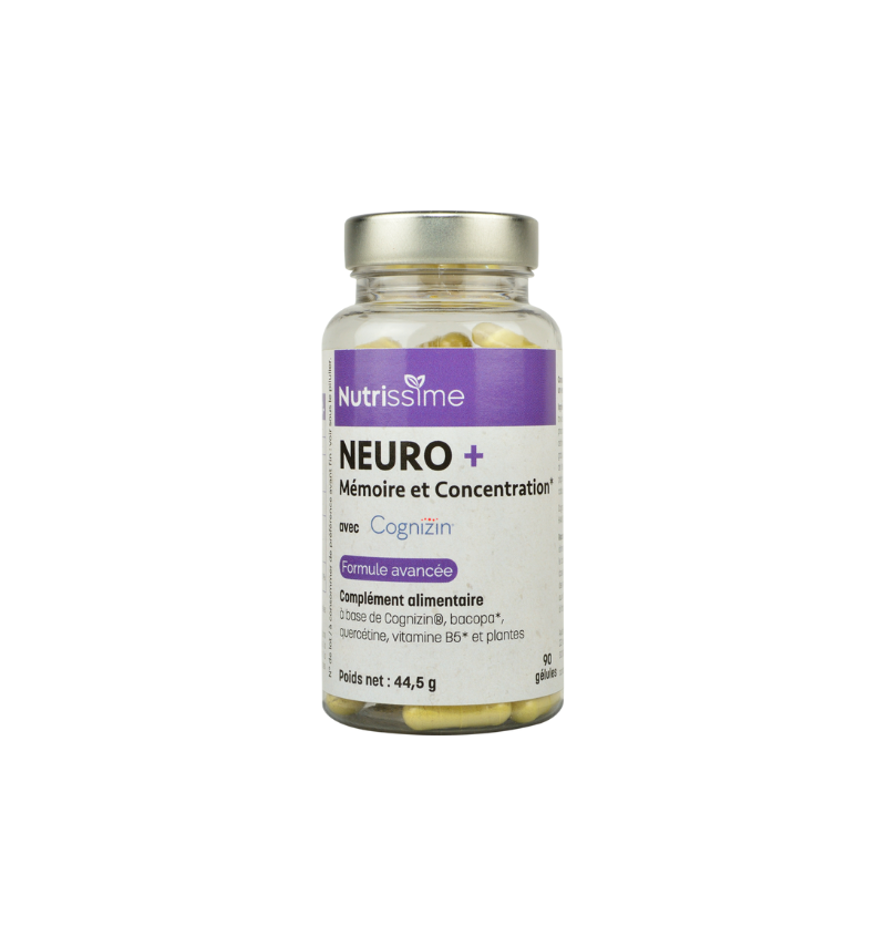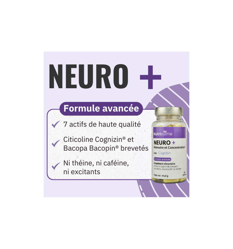 Neuro + Mémoire et Concentration* est une formule avancée à base de citicoline Cognizin® brevetée, quercétine, extrait de feuille de bacopa Bacopin® breveté, extrait sec de fleur de tagètes, extrait sec de pépin de raisin et acide pantothénique (vitamine B5).