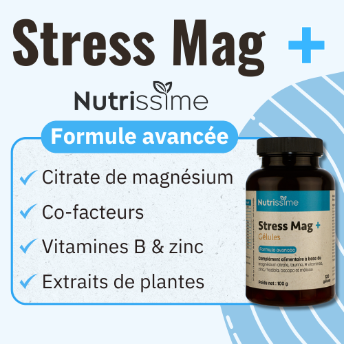 - Association vivement recommandée avec Stress Mag +, le complément qui apporte du magnésium pour réduire la fatigue, et des extraits de plantes adaptogènes pour augmenter la résistance du corps face au stress. Bénéfique en cas de période stressantes ou exigeant beaucoup de ressources mentales.