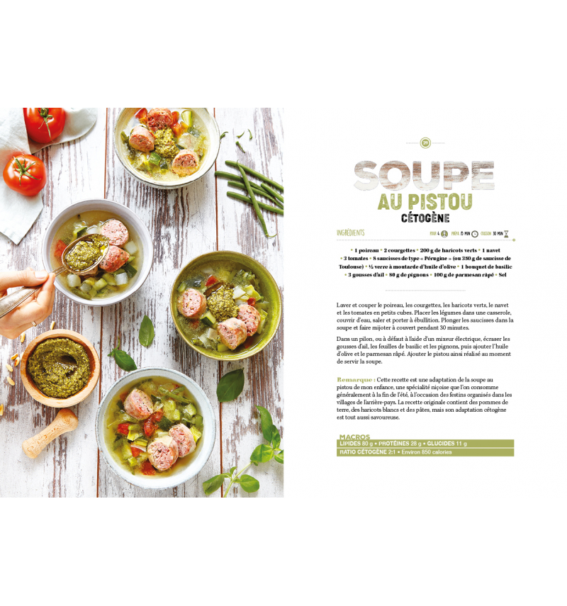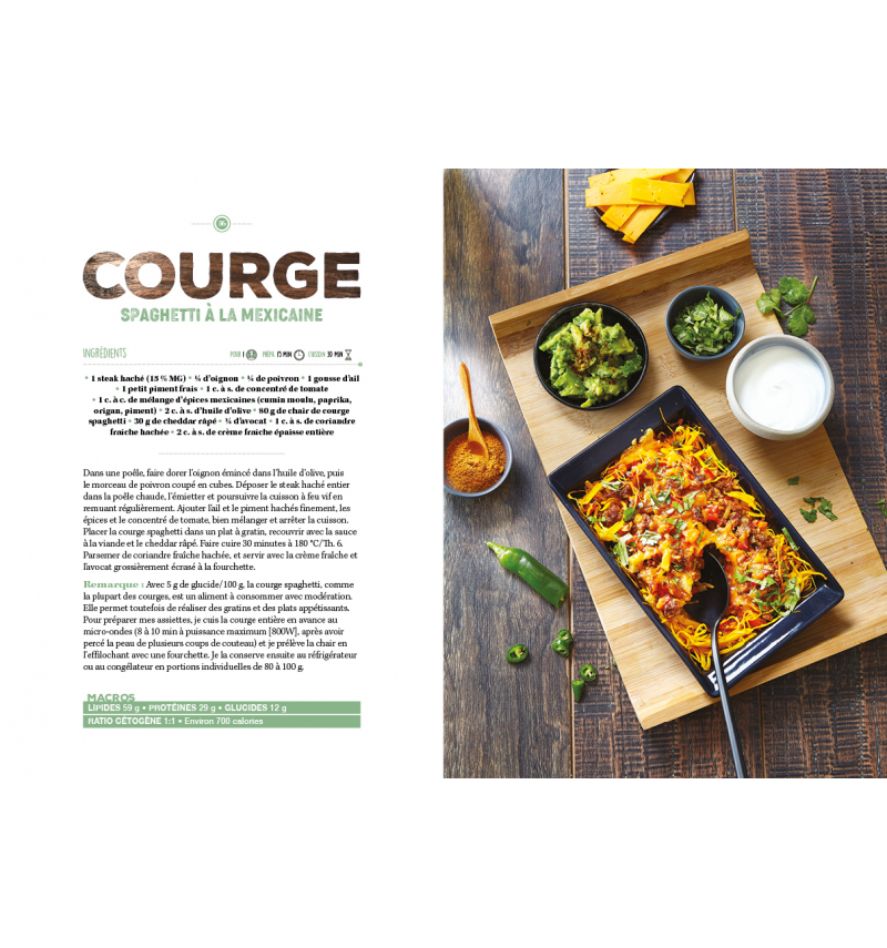 Pour chaque recette, sont indiqués les teneurs en protéines, glucides, lipides, calories et le ratio cétogène. Appréciable, quand on n’est pas diététicien(ne) !