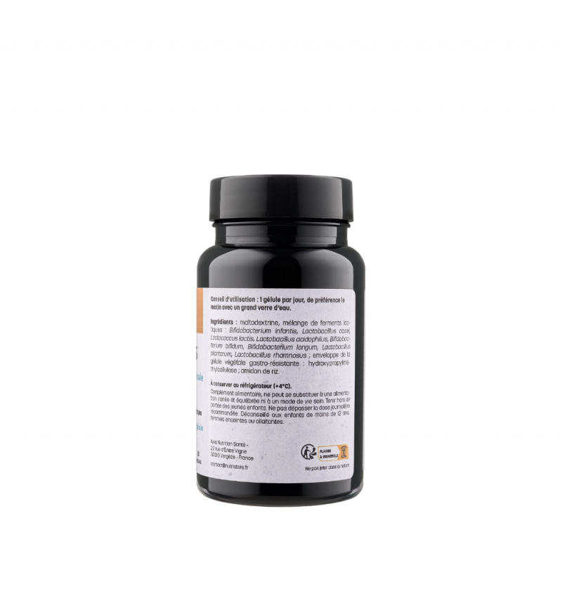 Ingrédients : maltodextrine, mélange de ferments lactiques : Bifidobacterium infantis, Lactobacillus casei, Lactococcus lactis, Lactobacillus acidophilus, Bifidobacterium bifidum, Bifidobacterium longum, Lactobacillus plantarum, Lactobacillus rhamnosus ; enveloppe de la gélule végétale gastro-résistante : hydroxypropylméthylcellulose ; amidon de riz.