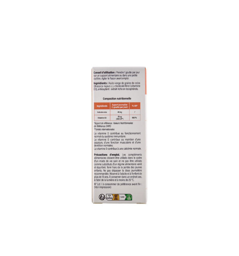 Ingrédients : Huile vierge de graine de colza (Brassica napus L.), cholécalciférol (vitamine D3), antioxydant : extrait riche en tocophérols.