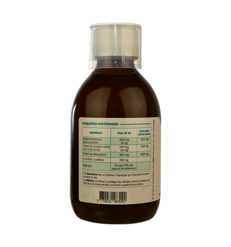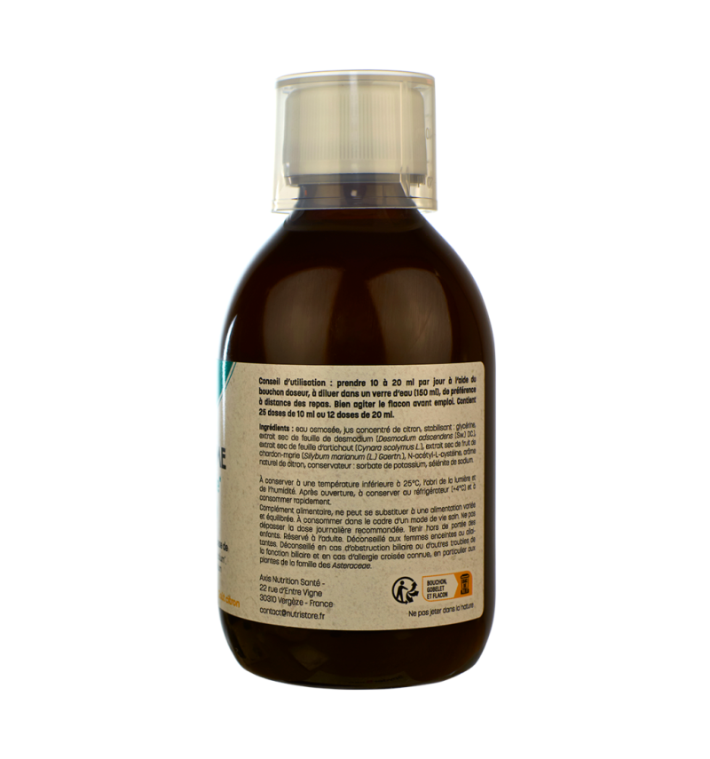 Ingrédients : Eau osmosée, jus concentré de citron, stabilisant : glycérine, extrait sec de feuille de desmodium, extrait sec de feuille d’artichaut, extrait sec de fruit de chardon-marie, N-acétyl-L-cystéine, arôme naturel de citron, conservateur : sorbate de potassium, sélénite de sodium.