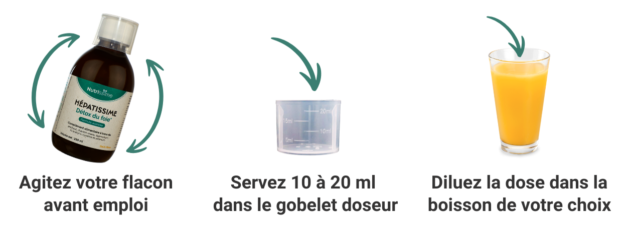Hépatissime est fourni avec un gobelet doseur permettant une simple mesure des doses : 10 ou 20 ml par jour selon vos besoins.