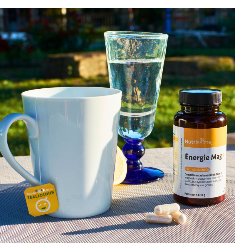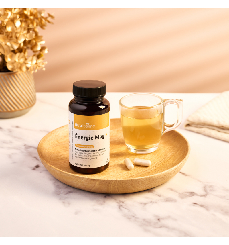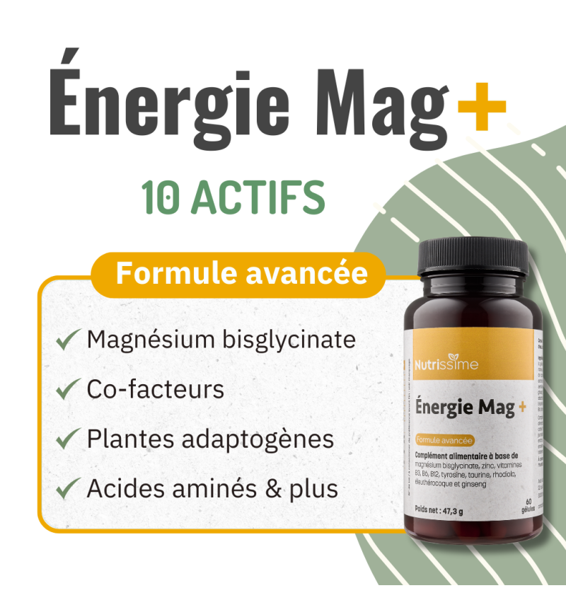- Énergie Mag+ le matin : 2 gélules (100 mg de magnésium)