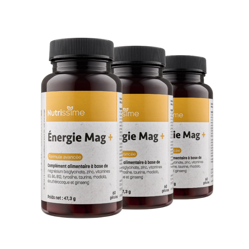 - Énergie Mag+ le matin : 3 gélules (150 mg de magnésium)