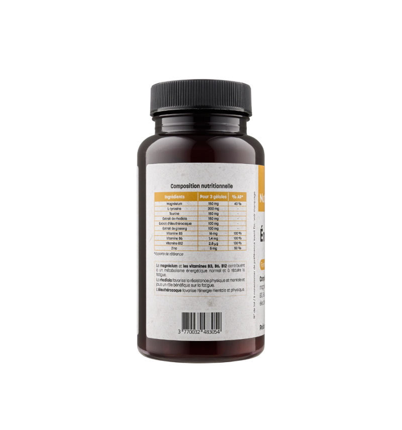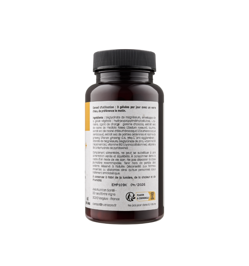 Bisglycinate de magnésium, enveloppe de la gélule végétale : hydroxypropylméthylcellulose, L-tyrosine, agent de charge : gomme d’acacia, extrait sec de racine de rhodiola rosea (Sedum roseum), taurine, extrait sec de racine d’éleuthérocoque (Eleutherococcus senticosus), extrait sec de parties aériennes et racine de ginseng (Panax ginseng C.A. Mey.), anti-agglomérant : stéarate de magnésium, bisglycinate de zinc, vitamine B3 (nicotinamide), vitamine B12 (cyanocobalamine), vitamine B6 (chlorhydrate de pyridoxine).