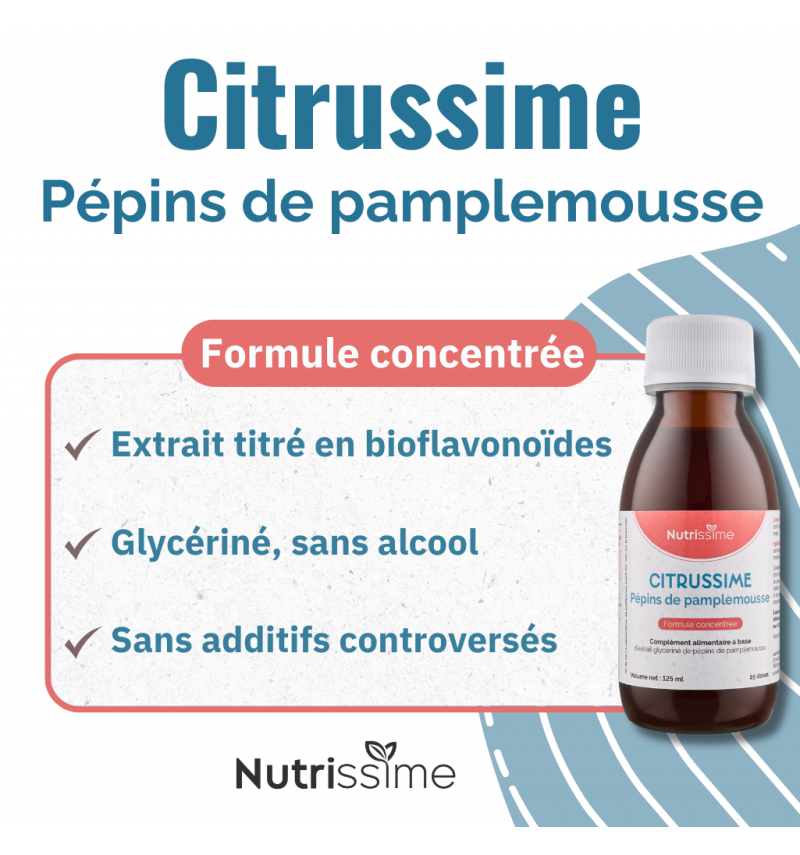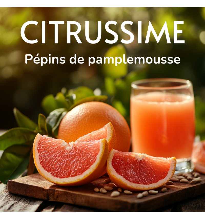 Citrussime est un complément alimentaire à base d’extrait glycériné de pépins de pamplemousse (Citrus paradisi Macfad.), reconnu pour son rôle dans le soutien du système immunitaire et la protection de l’organisme. Grâce à sa formule concentrée, il offre une biodisponibilité optimale et une consommation facile au quotidien.