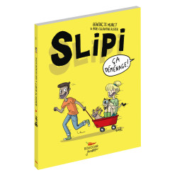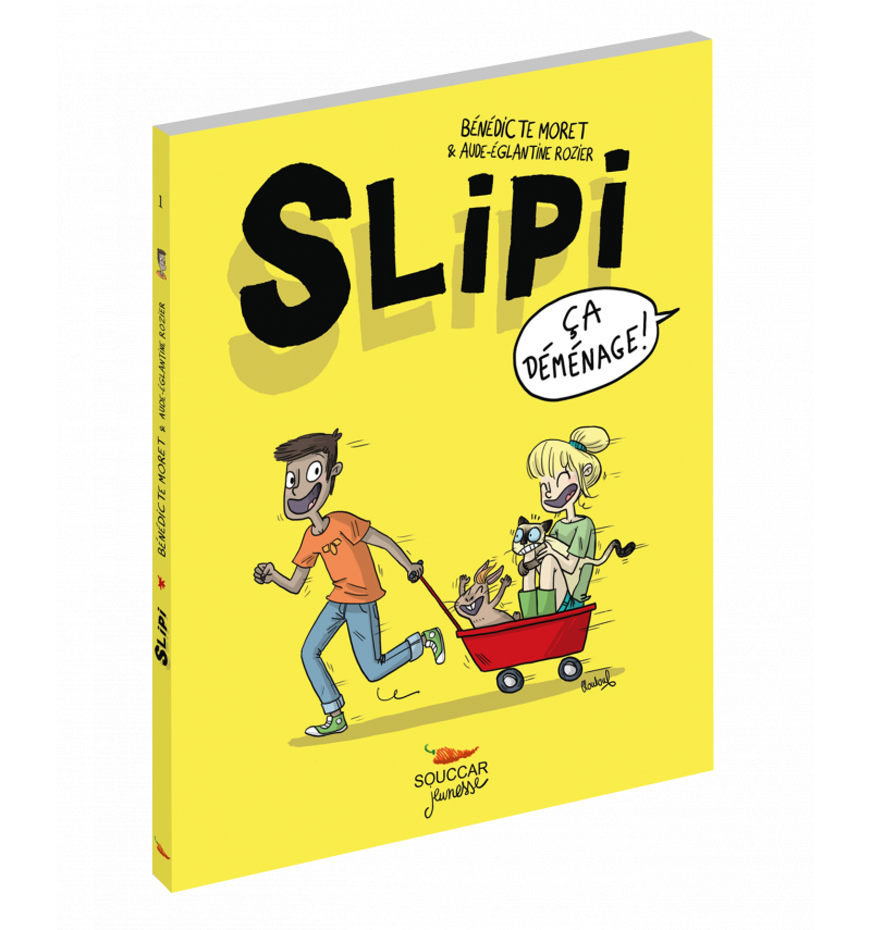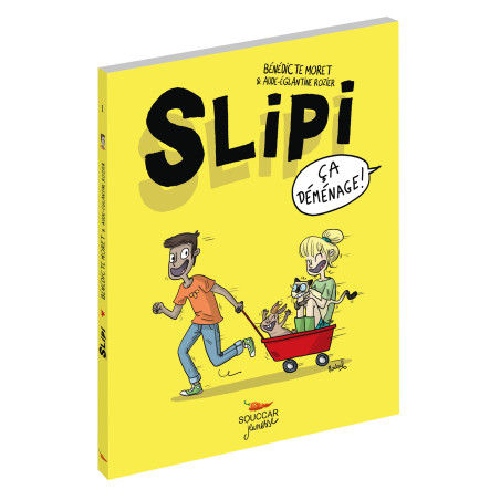 Premier livre sous le label "Souccar jeunesse", "Slipi ça déménage" est aussi le premier tome d'une série BD humoristique destinée aux 7-11 ans afin de les divertir tout en les faisant (un peu) réfléchir sur des sujets de société : surconsommation, écologie, addiction aux écrans...
