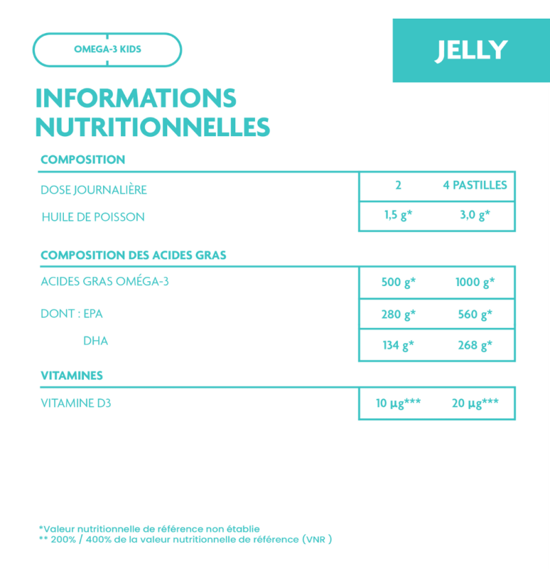 • 3-6 ans : 2 pastilles (500 mg d’oméga-3)