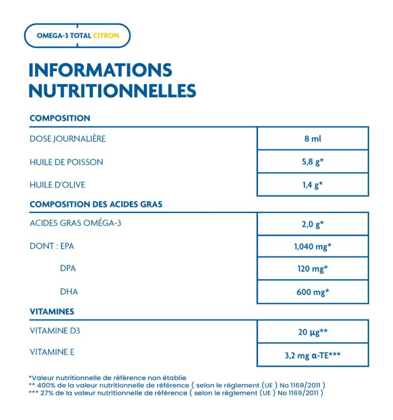 • 2000 mg d’oméga-3 par dose journalière (8 ml)
