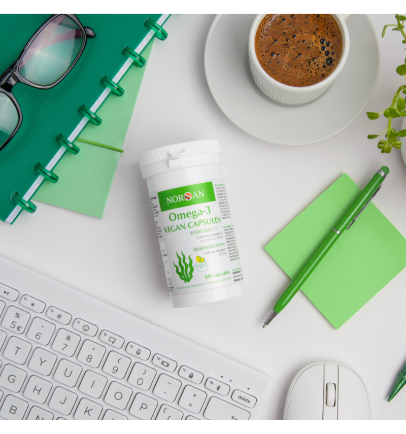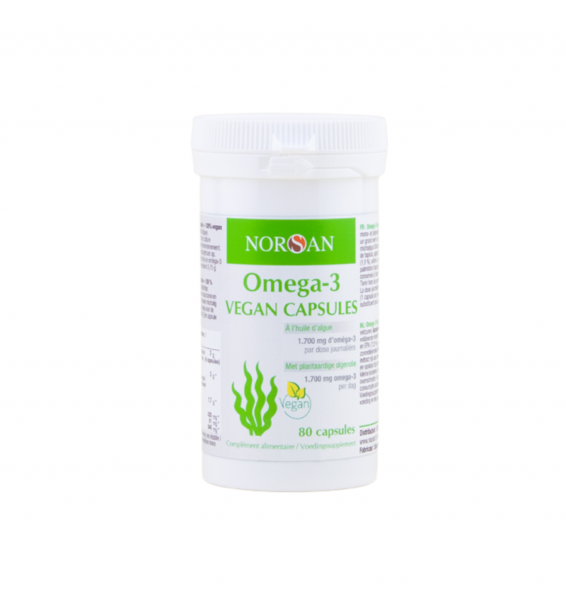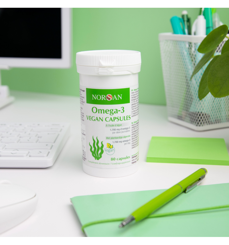 NORSAN Omega-3 Vegan Capsules contient une huile végétale d'algue hautement dosée en oméga-3.
