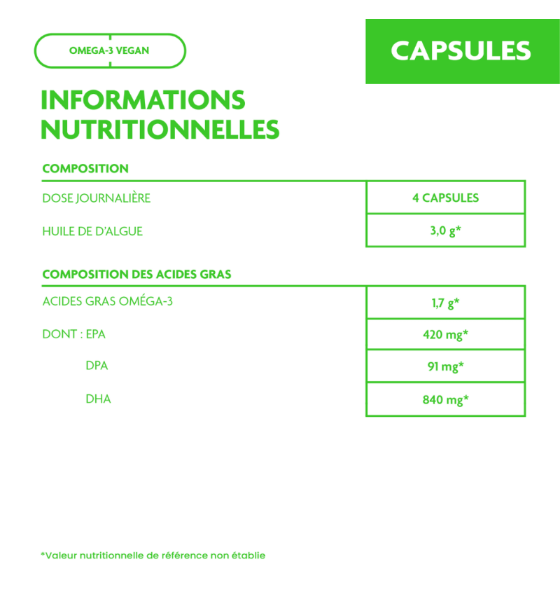 Ingrédients : Huile extraite de la microalgue Schizochytrium sp. à teneur élevée en DHA et EPA (72,6 %), amidon modifié de tapioca, agent humectant : glycérine, huile de tournesol, arôme : extrait de romarin, antioxydants : extrait riche en tocophérols et palmitate d’ascorbyle.