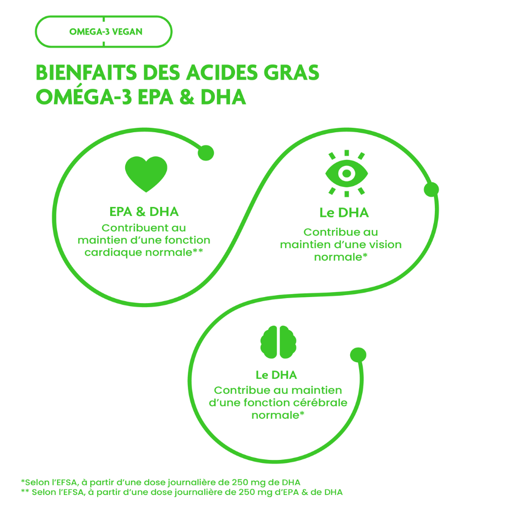 *Selon l’EFSA à partir de 250 mg de DHA. **Selon l’EFSA à partir de 250 mg d’EPA & de DHA.