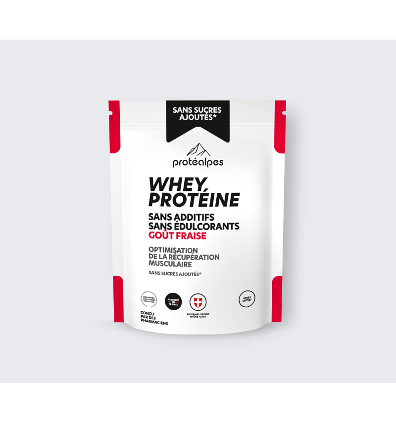 La Whey Protéine sans sucre goût fraise de Protéalpes est spécialement conçue pour ceux recherchant un goût non sucré tout en bénéficiant des avantages d’une protéine de haute qualité. Fabriquée à partir d’isolat de protéines de lactosérum provenant de lait de vaches élevées en pâturages alpins, cette whey se distingue par sa pureté : elle est sans additifs, sans édulcorants, et certifiée sans gluten. Riche en BCAA (acides aminés essentiels), elle est idéale pour le renforcement musculaire et la récupération.
