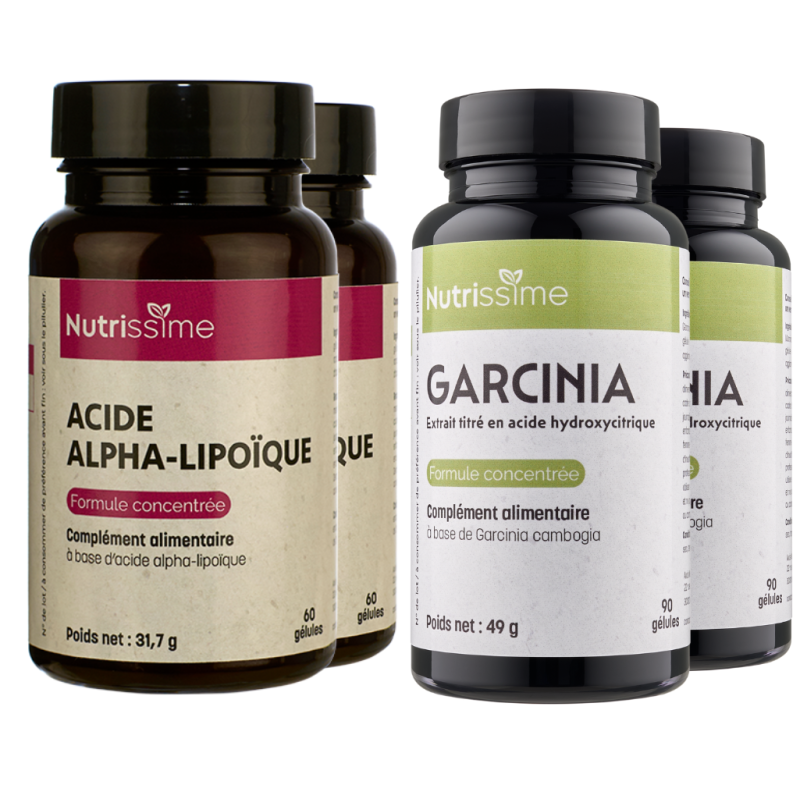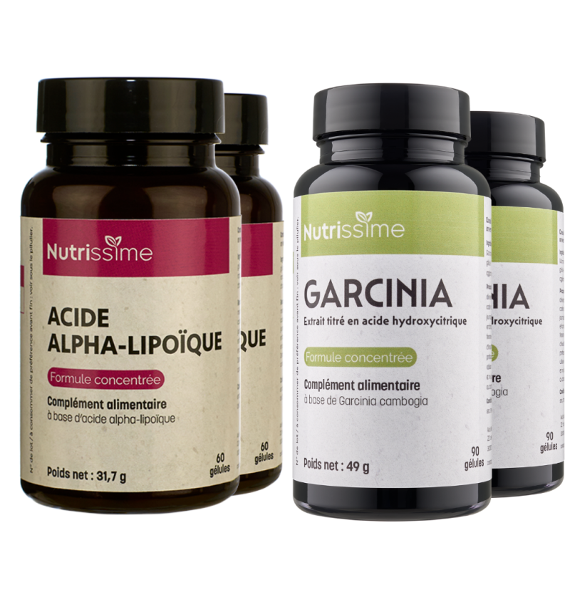 Ce pack contient 4 flacons : 2 flacons de Garcinia (source naturelle d'hydroxycitrate, seule forme autorisée en France) et 2 flacons d'Acide Alpha-Lipoïque.
