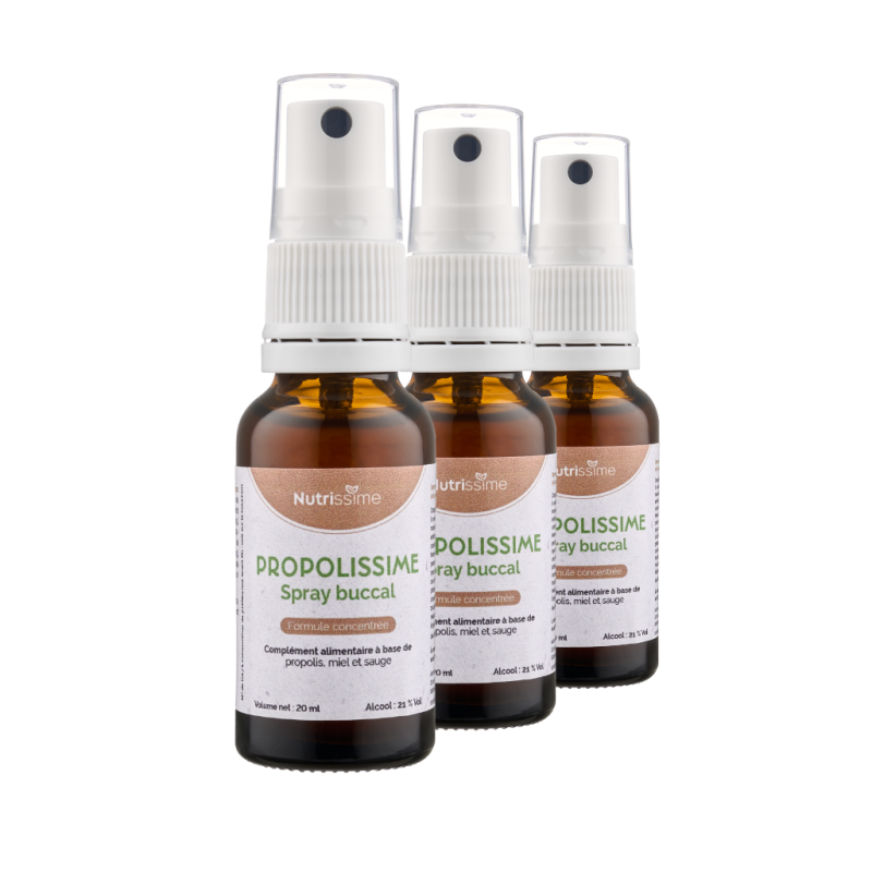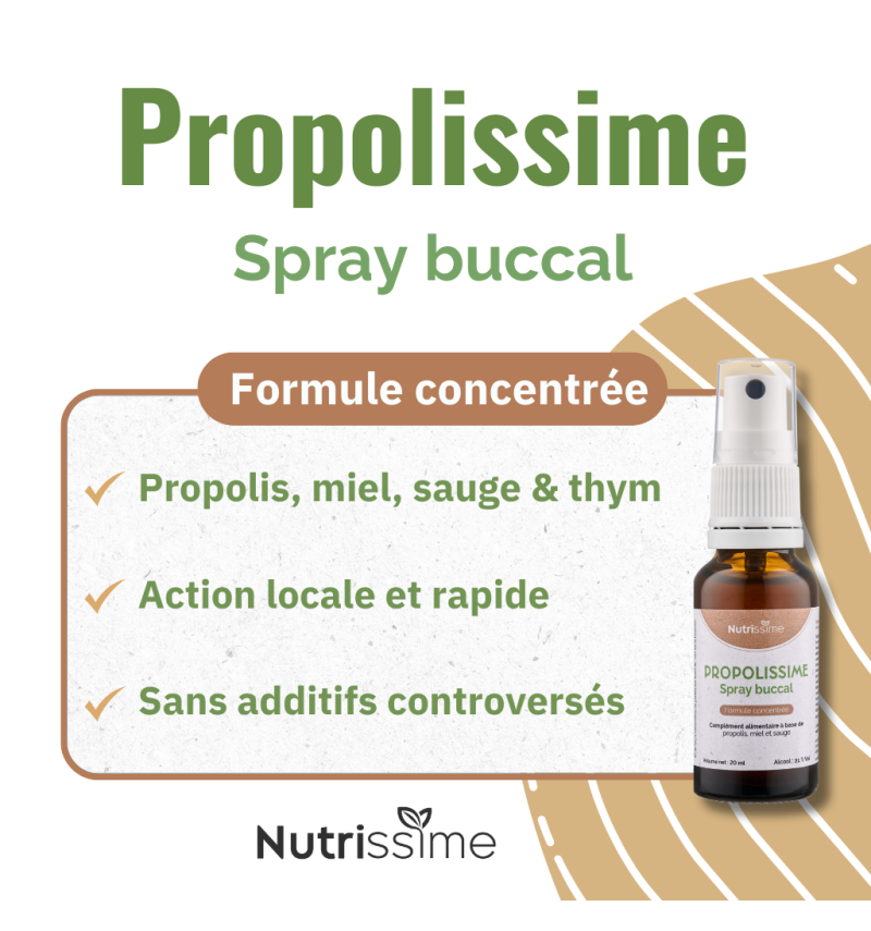 Propolissime est un spray buccal formulé à base d’ingrédients rigoureusement sélectionnés pour apaiser et protéger la gorge. Sa formule concentrée associe les bienfaits de la propolis, du miel, de la sauge et de l'huile essentielle thym, des actifs naturels plébiscités pour leur action assainissante et apaisante.