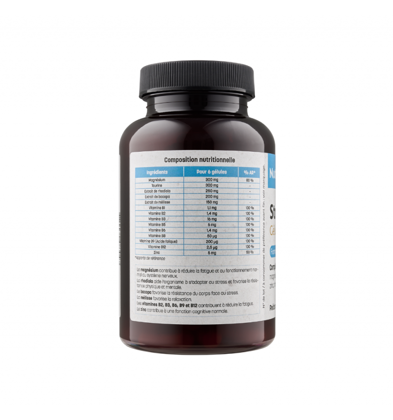 - La base de Stress Mag+ reste inchangée : citrate de magnésium (forme biodisponible), ensemble complet de vitamines B (B6 co-facteur), taurine et extraits de plantes adaptogènes.