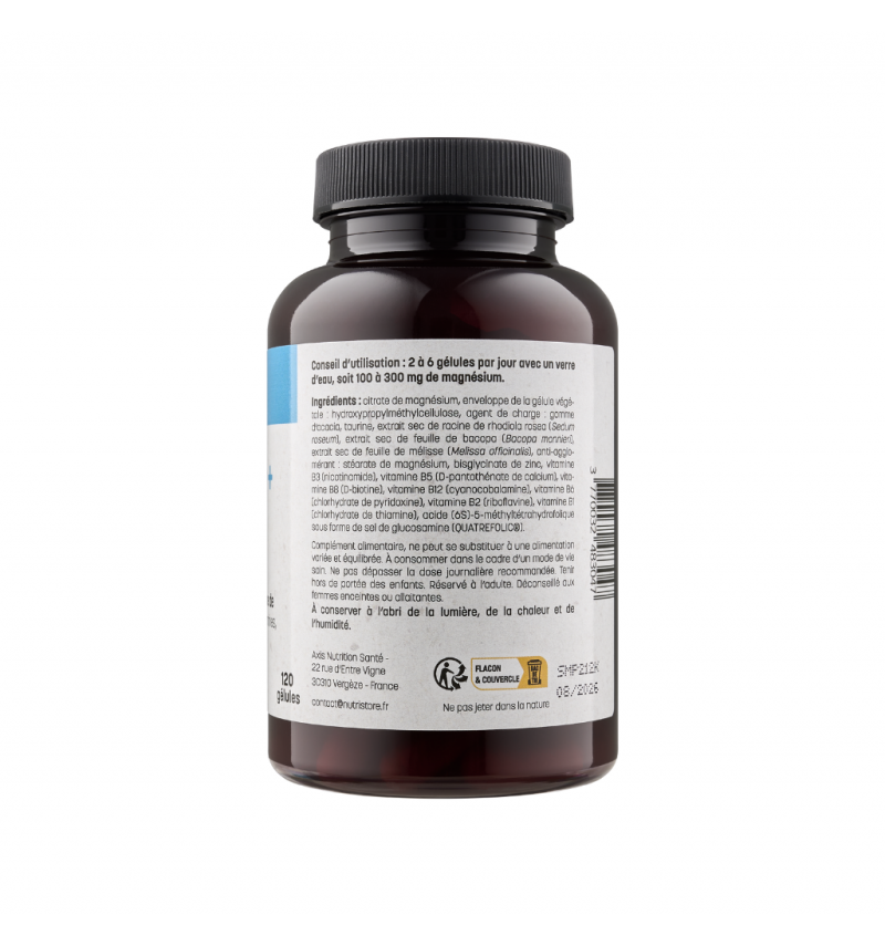 Citrate de magnésium, enveloppe de la gélule végétale : hydroxypropylméthylcellulose, agent de charge : gomme d’acacia, taurine, extrait sec de racine de rhodiola rosea (Sedum roseum), extrait sec de feuille de bacopa (Bacopa monnieri), extrait sec de feuille de mélisse (Melissa officinalis), anti-agglomérant : stéarate de magnésium, bisglycinate de zinc, vitamine B3 (nicotinamide), vitamine B5 (D-pantothénate de calcium), vitamine B8 (D-biotine), vitamine B12 (cyanocobalamine), vitamine B6 (chlorhydrate de pyridoxine), vitamine B2 (riboflavine), vitamine B1 (chlorhydrate de thiamine), acide (6S)-5-méthyltétrahydrofolique sous forme de sel de glucosamine (QUATREFOLIC®).