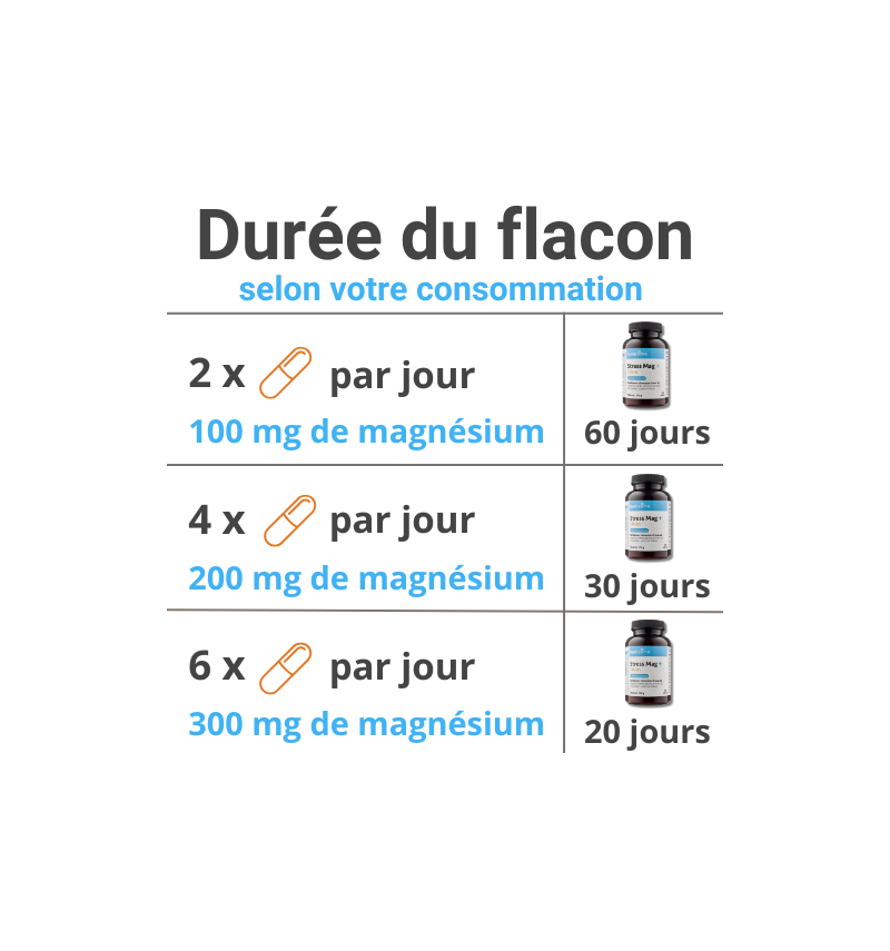 | Dosages Stress Mag vs & Énergie Mag+ | 3 gélules par jour | 2 à 6 gélules/comprimés par jour |