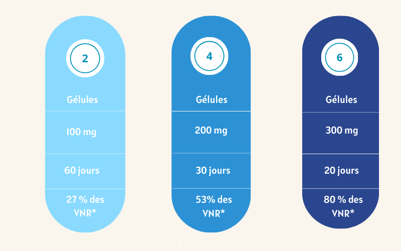 En cas d’hésitation, nous vous recommandons de débuter avec la posologie minimale, soit 2 gélules par jour.